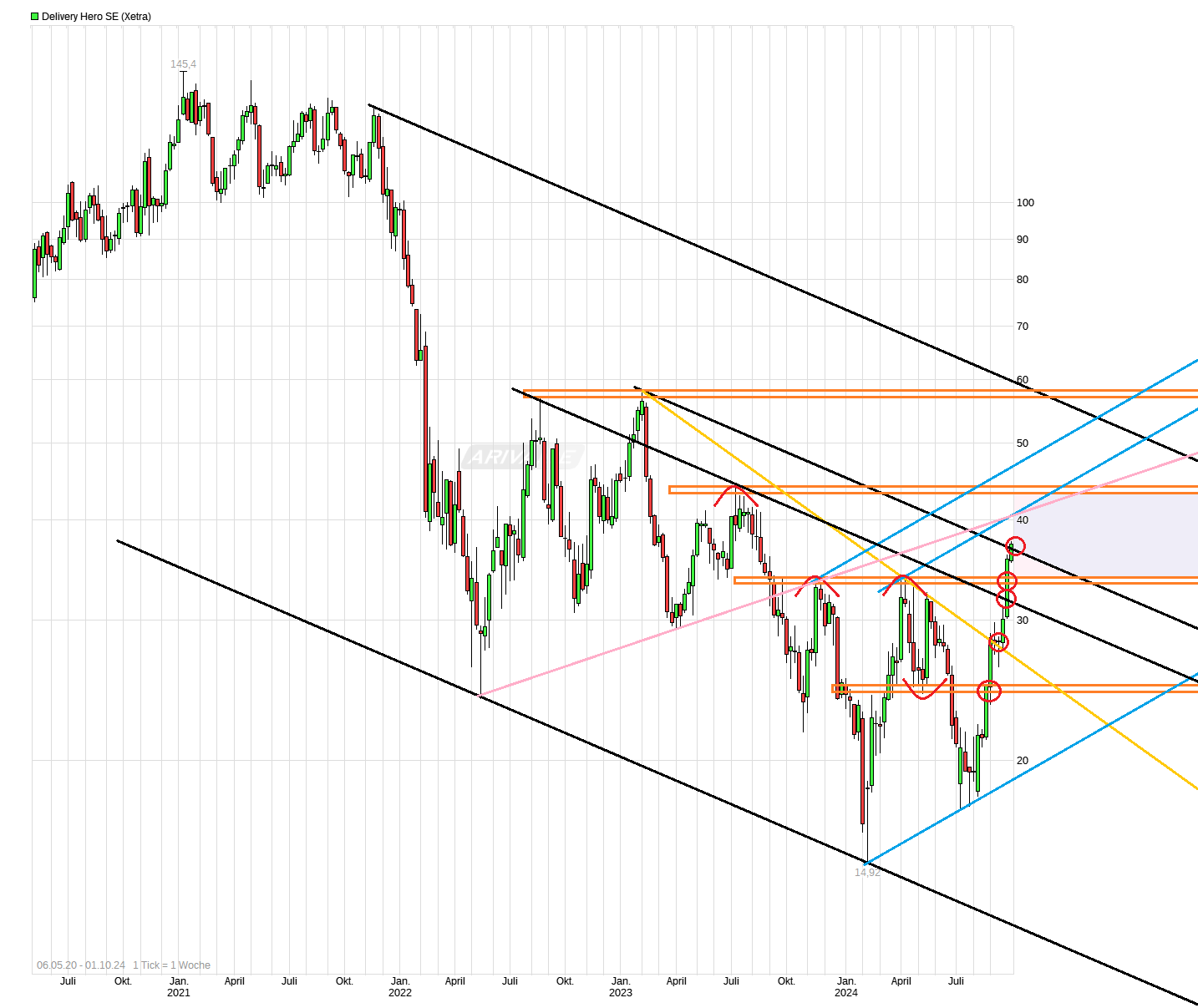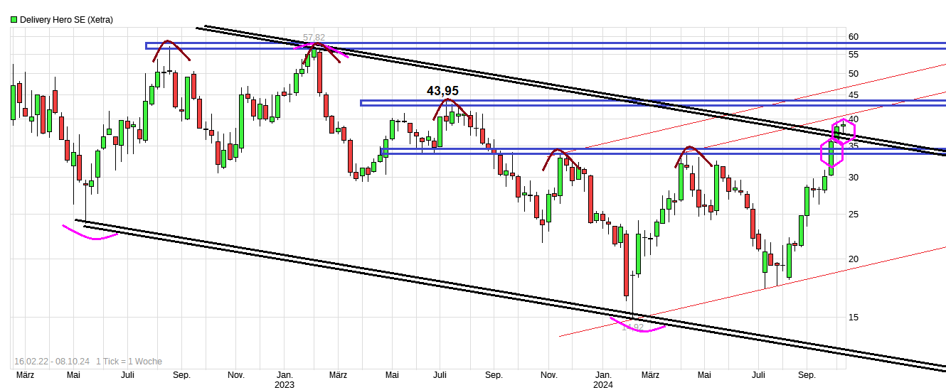 Wie schon in den Wochen zuvor, ist weiterhin Talabat im Vordergrund beim Kurs. Heute gibt es eine Investoren-Veranstaltung zu Talabat. Man hofft auf weitere gute Tendenzen, damit der IPO zu einem möglichst hohen Ausgabekurs über die Bühne gehen kann. Laut dem Artikel von heute sind inzwischen sogar von 20 Mrd Dollar als Bewertung für Talabat die Rede. Also das wäre nochmal deutlich mehr als was man vor kurzer Zeit dazu gehört hat. Mal abwarten was also heute alles gesagt wird zu Talabat. Wichtig wäre natürlich auch etwas näher zu erfahren wann denn im 4.Q. der IPO über die Bühne gehen soll. Im Chart wäre der nächste größere horizontale Widerstand im Bereich um 44 Euro. Also meinetwegen darf man sich weiter in diese Richtung bewegen.