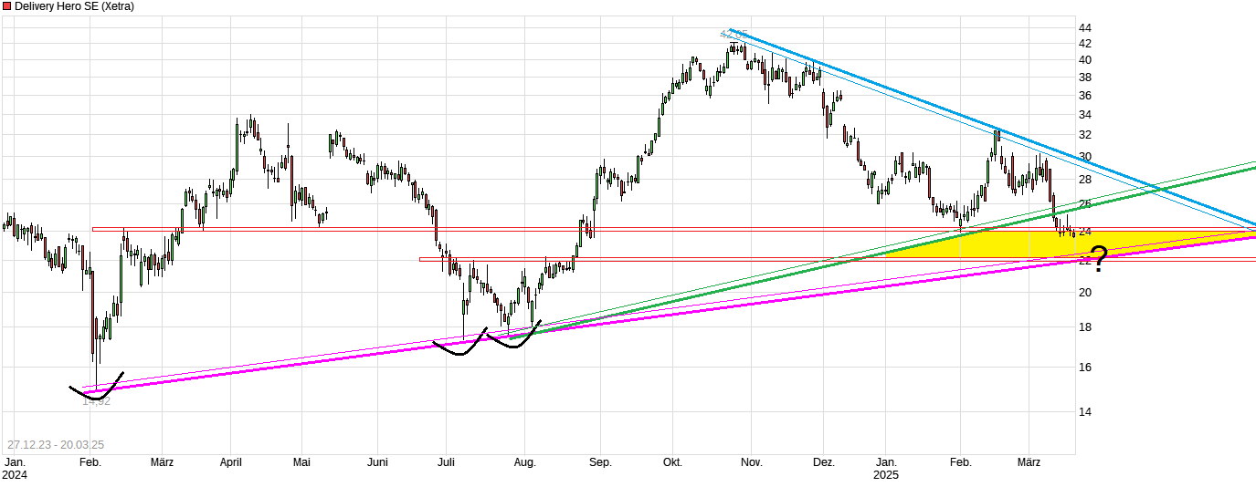 Ist also etwas tricky zu entscheiden was hier jetzt der größere Impuls war für die Reaktion. Bin trotzdem spekulativ mit einer ersten Teilposition wieder dabei, weil ich grundsätzliche denke im unteren 20er Bereich um 21/23 sollte eine Gegenreaktion möglich sein ( ca. 50% Rückgang vom Oktober-Top). Sollte es doch nochmal etwas tiefer gehen, würde ich etwas weiter nochmal nachlegen. Ich hoffe auch, daß eine mögliche Kartellstrafe hinreichend durch die Rückstellungen abgedeckt wäre und es auch helfend wäre diesen Unsicherheitspunkt wegzuhaben. Also mal schauen was ab nächster Woche weiter passiert. Man hat natürlich jetzt direkt die Region um 24,/25€ (Tiefststände von Ende Jan./Anfang Feb.) vor der Nase, die man jüngst als Unterstützung durchbrochen hatte. So etwas wird dann auch gerne mal umgekehrt zum Widerstand. Da ist bislang noch kein nachhaltige Rückkehr darüber passiert. Ist somit alles noch etwas zwischen Baum und Borke. Entsprechend ist der eingesetzte Betrag der ersten Teilposi bislang noch eher klein gehalten bis Dinge sich vielleicht etwas mehr verfestigen.