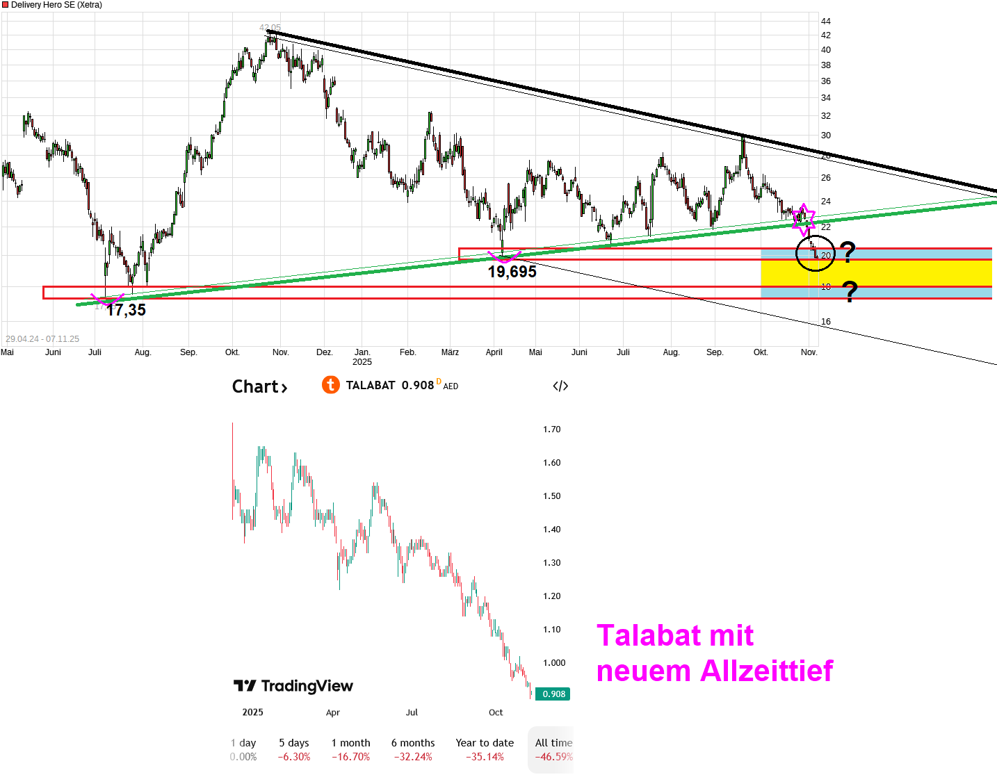 Das man nun die Jahresprognose für den Gewinn senken muß, ist auch zu einem guten Teil eigene Schuld. Schon im Frühjahr sind doch schon der US Dollar und der Korea Won deutlich schwächer geworden. Warum hat man also nicht da bereits viel vorsichtiger prognostiziert und schwache Währungstendenzen für das ganze Jahr antizipiert? Habe mir auch die Q&A Runde beim CC mal durchgelesen. Sind einige interessante Stellen dabei. Ein Statement ist, daß man bei Talabat zu den tief gefallenen Kursen erst einmal keine weiteren Anteile abgeben will. Die Frage ist nur wann die Talabat-Aktie überhaupt mal einen Boden findet. Seit dem IPO schaukelt man von Allzeit-Tief zu Allzeittief. Gesamtwert inzwischen deutlich unter 7 Mrd. Euro. DH hat noch immer 80% Anteil an Talabat und damit einen Substanzverlust im Milliardenhöhe seit dem IPO hier zu verzeichnen. Würde mal Talabat die Kurve deutlicher nach oben wieder bekommen, dann wäre es wohl auch für die DH Aktie leichter sich zu erheben.