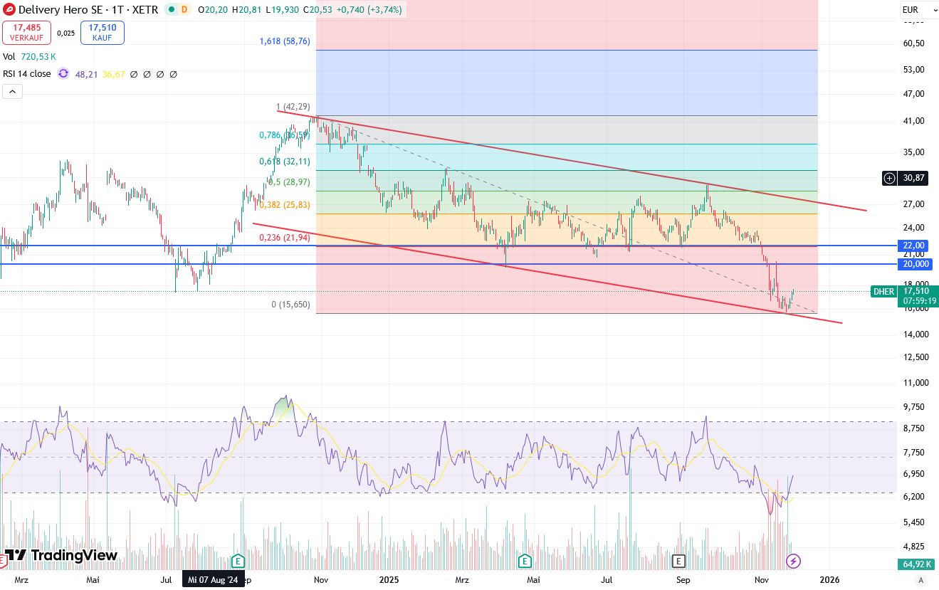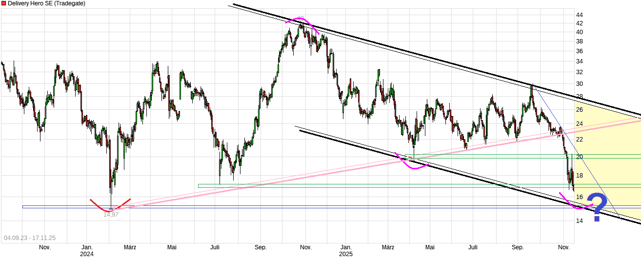 Delivery Hero rutschen auf tiefsten Stand seit Sommer 2024 - 07. November 2025, 20:08 https://www.ariva.de/aktien/...ero-rutschen-auf-tiefsten-rsf-11812012 "... Damit weiten die Papiere ihre jüngste Korrektur vor den anstehenden Quartalszahlen aus, die das Unternehmen am Donnerstag kommender Woche veröffentlichen will. Allein in der laufenden Woche sackte der Kurs um rund 16 Prozent ab. Seit seinem Zwischenhoch von fast 30 Euro Mitte September ging es um 38 Prozent nach unten. Händler führten die Kursverluste zum einen auf eine skeptischere Bewertung von Wachstumsunternehmen zurück. Zum anderen hatte es am Donnerstag einen Bloomberg-Bericht über ein Interesse des US-amerikanischen Fahrdienstleisters und Essenslieferanten Uber an dem türkischen Lieferdienst Getir gegeben. Delivery Hero ist in dem Land mit dem Getir-Konkurrenten Yemeksepeti vertreten. Der Börsenwert von Delivery Hero ist in diesem Jahr inzwischen um rund ein Drittel auf 5,5 Milliarden Euro gefallen. Zum Vergleich: Anfang 2021, zum Höhepunkt der Corona-Pandemie, hatten die Aktien zeitweise mehr als 145 Euro gekostet. Das Unternehmen war damals fast 30 Milliarden Euro wert...Größter Anteilseigner des Unternehmens ist mit rund 27 Prozent die auf Technologieunternehmen spezialisierte Beteiligungsgesellschaft Prosus , die erst vor wenigen Wochen den Delivery-Hero-Konkurrenten Just Eat Takeaway (Lieferando) für etwas mehr als vier Milliarden Euro übernommen hat. ..."