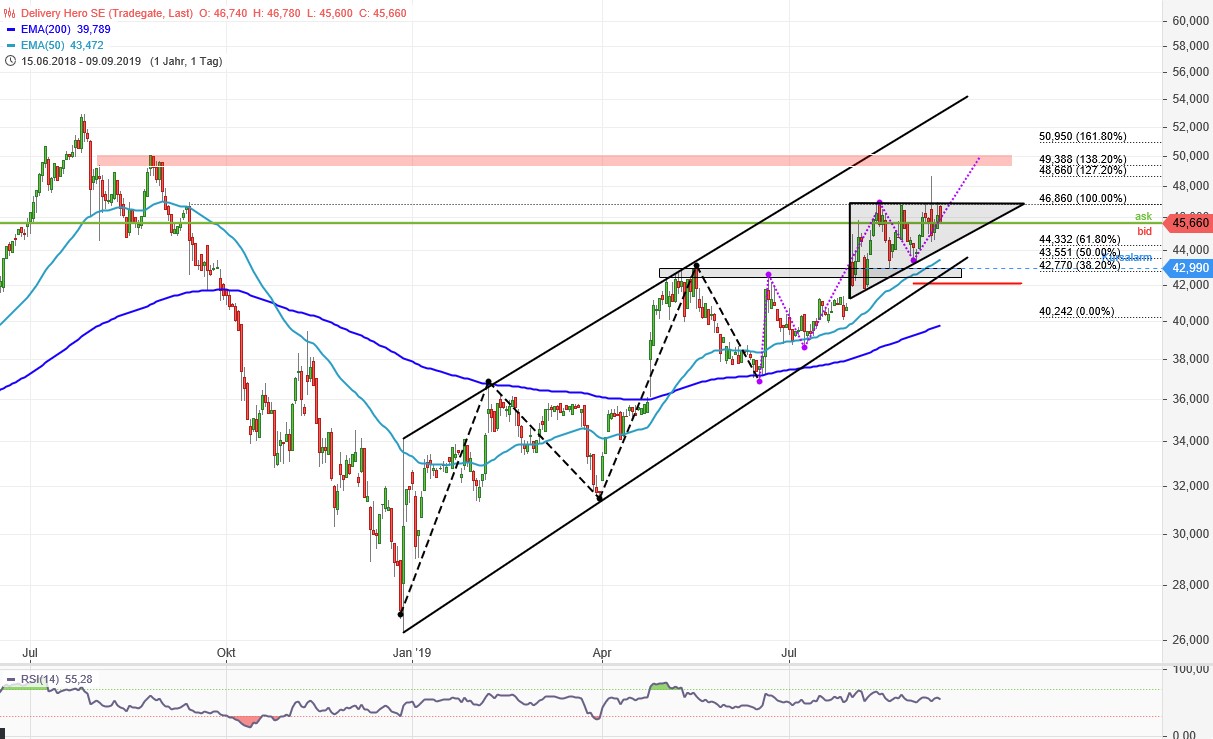 Technisch baut DH Druck nach oben auf. Momentan wird der Kurs bei 47,00 gedeckelt, allerdings zeichnet sich ein steigendes Dreieck heraus, welches auf einen Ausbruch auf der Oberseite deutet.
