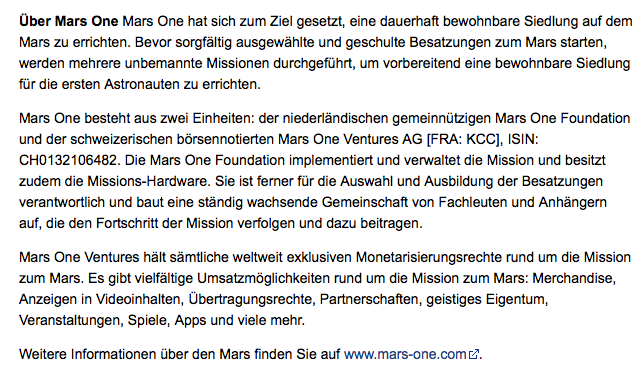 Was wird mit dem neuen Thread zur Mars One Venture AG beabsichtigt, wenn dort sachliche Beiträge, wie der Folgende, nicht erwünscht zu sein scheinen ?