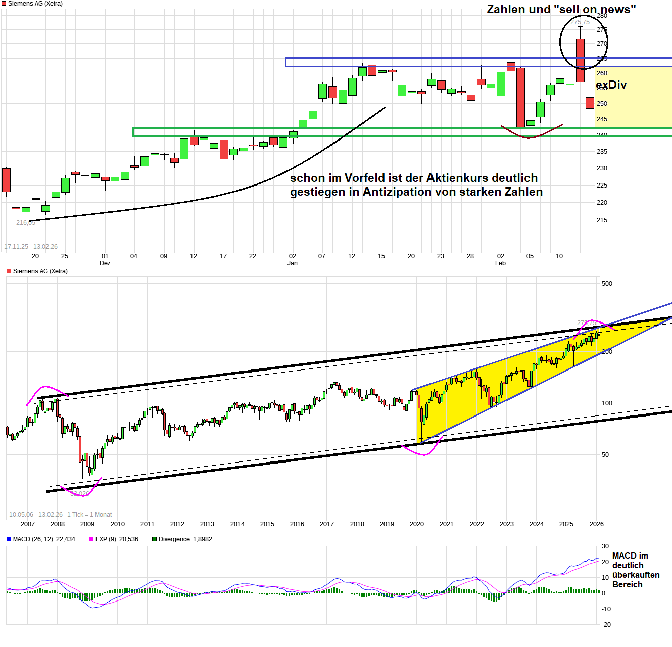 Zum einen ist es nicht ungewöhlich, daß Aktien nach einer HV erst einmal neben dem ex Div Abschlag eine weitere Korrektur sehen (besonders wenn die bis zur HV hoch gestiegen sind), zum anderen herrscht halt weiter die KI Angst vor bei allen Firmen die nennenswert mit Software ihr Geld verdienen. Und da hat Siemens sie letzten Jahre auch deutlich Gewicht zugelegt was die Software-Geschäfte betrifft. Entsprechend steckt man jetzt mit den ganzen anderen Aktien aus dem Software-Bereich im Sog nach unten Zur Erinnerung der Artikel aus dem Aktionär von letzter Woche: