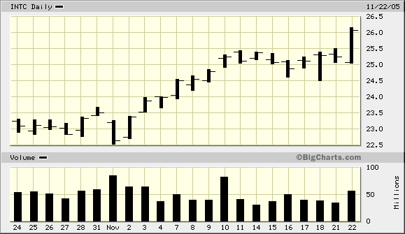Du hattest Recht mit dem Tief bei 22,50 USD. Seit einem Monat geht der Kurs steil nach oben - und der letzte Sprung kam sogar bei erhöhtem Volumen. Es gibt viele Hedge-Fonds, die in der Vorweihnachts-Rallye Boden gut machen wollen. Die kaufen dann "High-Beta"-Aktien wie Intel. Und wenn es erst mal steigt, steigt es meistens weiter...