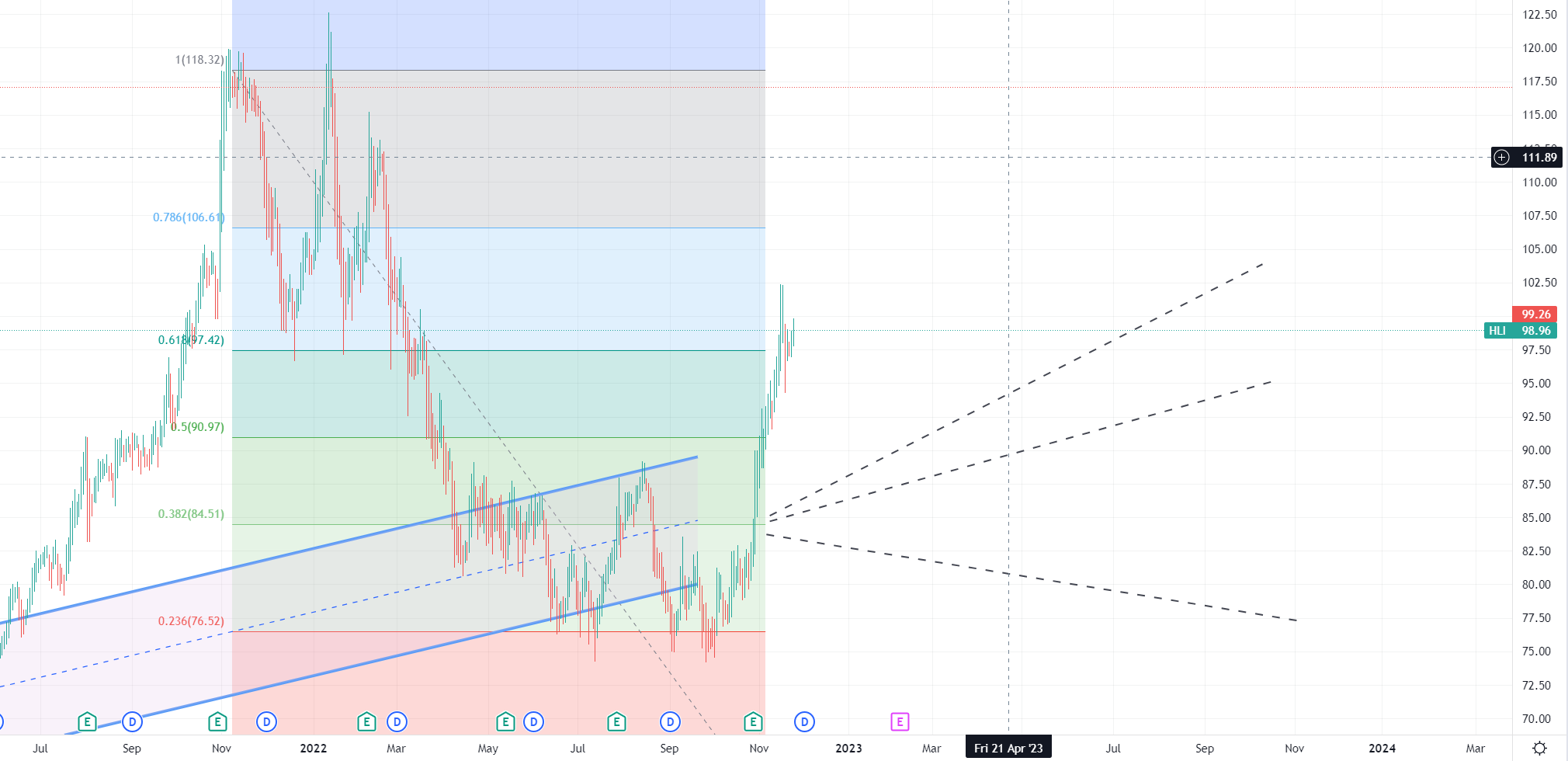 Für Houlihan bedeutet das erstmal, bei einem Abprall auf Retracekanten oder gar an tieferen U-Linien, dass das nicht zwingend eine Trendumkehr oder -fortsetzung sein muss. Ich finde das Unternehmen nach wie vor gut, insbesondere wenn man schonmal Geld damit verdient hat. Aber HL leidet auch unter Personalmangel und wenn es eine Rezession in Q32023 gäbe, geht’s wieder runter.