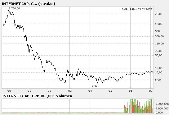 Ein Vergleich der beiden bei CMGI und Internet Capital zeigt, dass die bei CMGI sehr viel hektischer verlief. Das deutet meines Erachtens darauf hin, dass bei CMGI sehr viel mehr Zocker am Werk sind, während der Anstieg bei Internet Capital von den Instituionals getrieben wird. Ein Zocker ist daher wohl mit CMGI besser bedient, ein Anleger meines Erachtens aber mit Internet Capital, da hier die langfristigen Vervielfachungschancen größer sind.