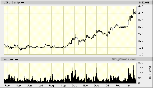 JDS could sure use that kind of buoyancy. It posted losses of $38.6 million on $166.3 million in revenues in the third quarter of 2005, which ended on Mar. 31 -- way more than the $7.3 million it lost on $161.4 million in sales in the year-ago period. It's also burning through $21.6 million in cash a quarter.