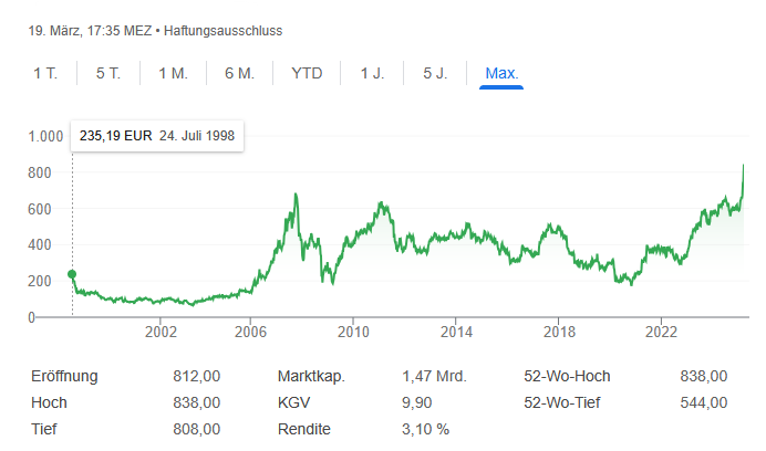 Neues 10-Jahreshoch. Wenn jetzt im Mai noch eine ähnlich fette Dividende kommt wie im Vorjahr, ist es ein kompletter Hit. KSB ist die erfolgreichste Aktie bei mir im Depot. Inzwischen liege ich über 200% im Plus - inkl. Dividenden sogar über 223%.