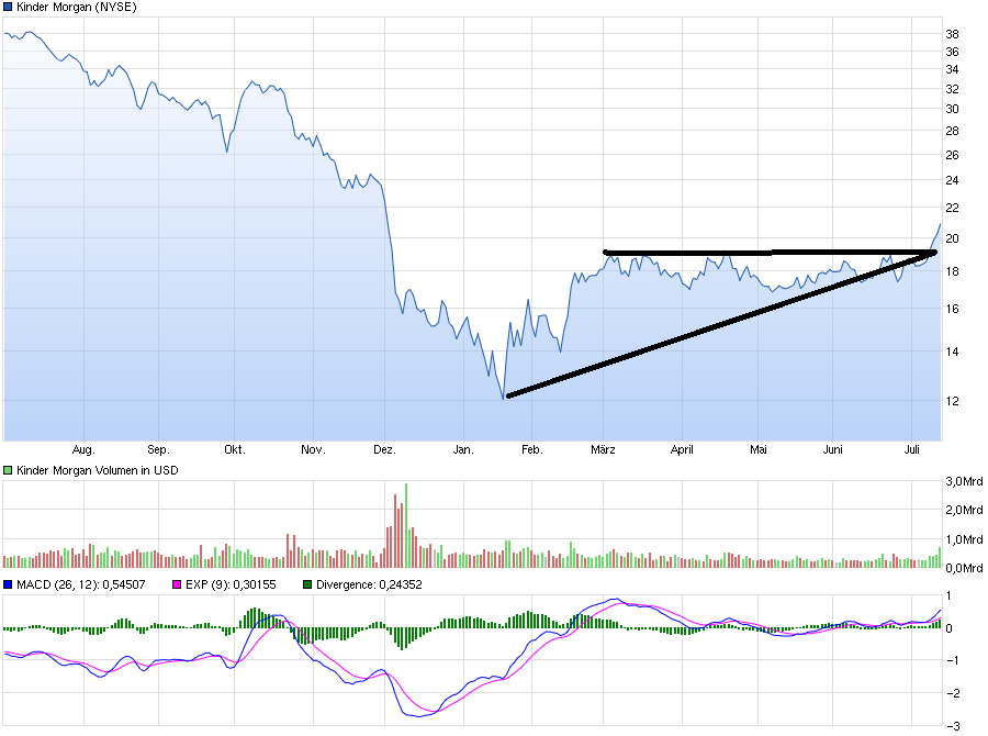 KMI hat 50% eines Pipeline Systems verkauft und ist eine strategische Partnerschaft eingegangen. Das führt zu einer Stärkung der Bilanz und wird wohl deshalb positiv bewertet.