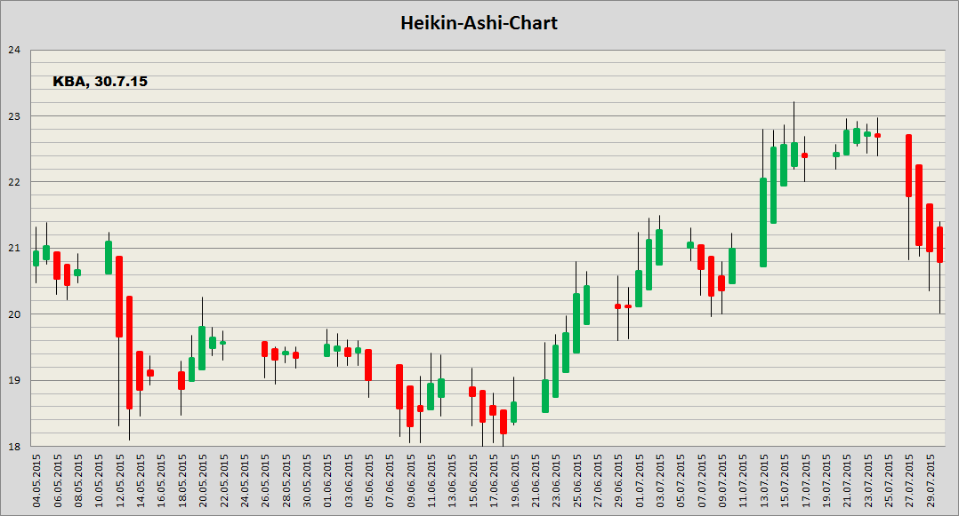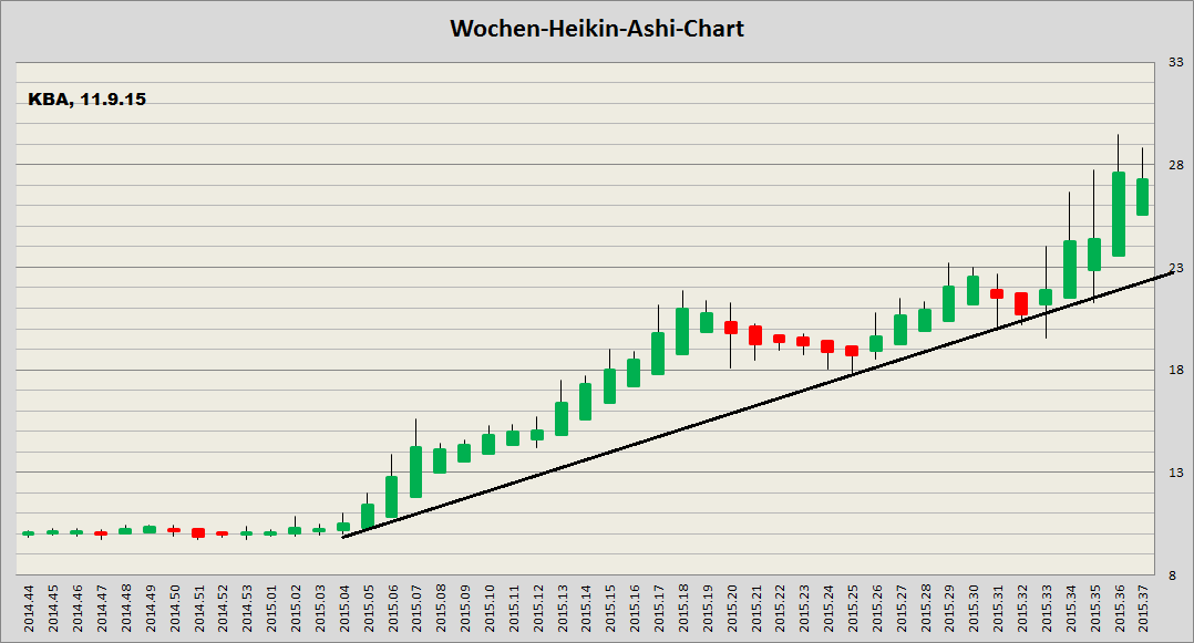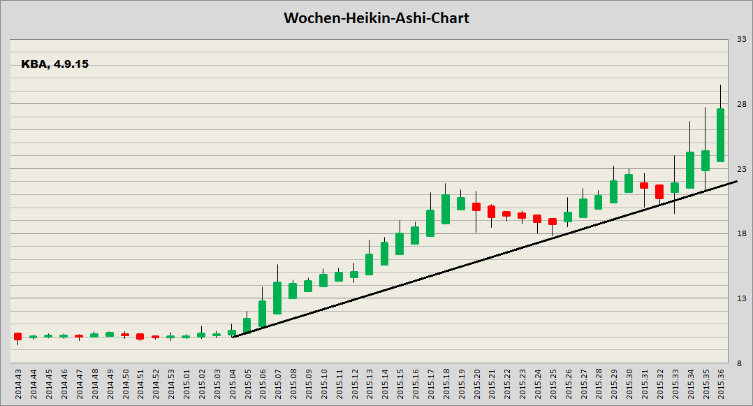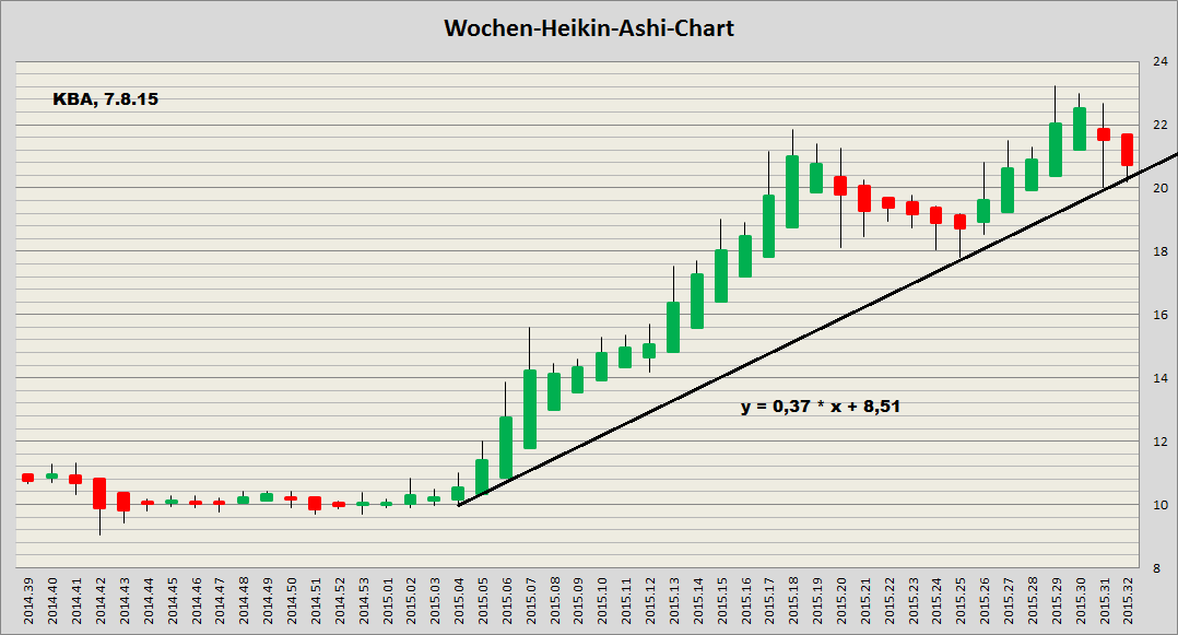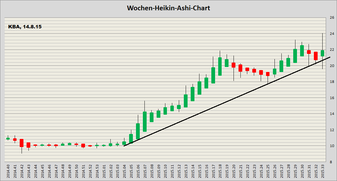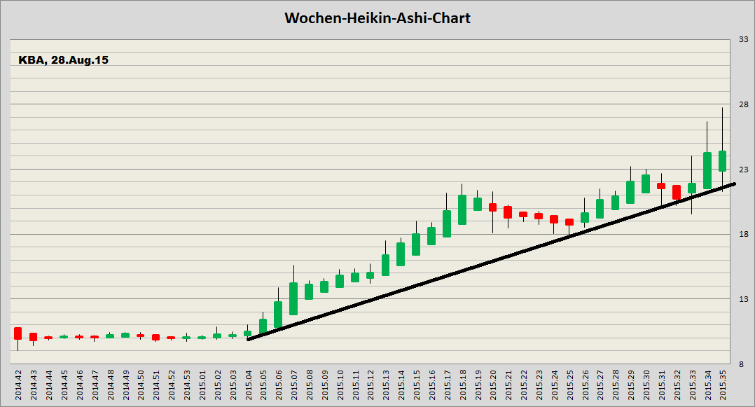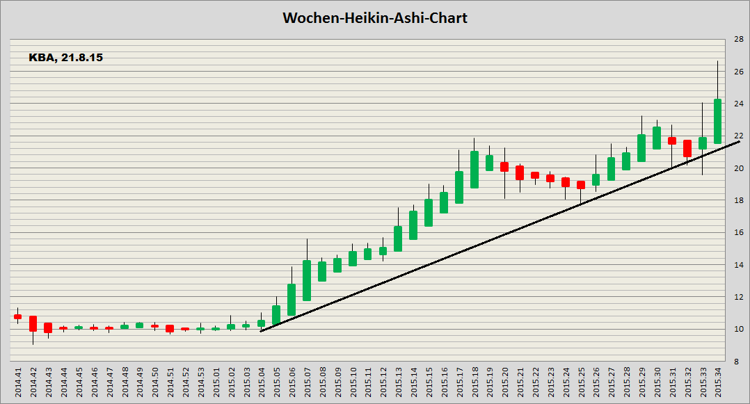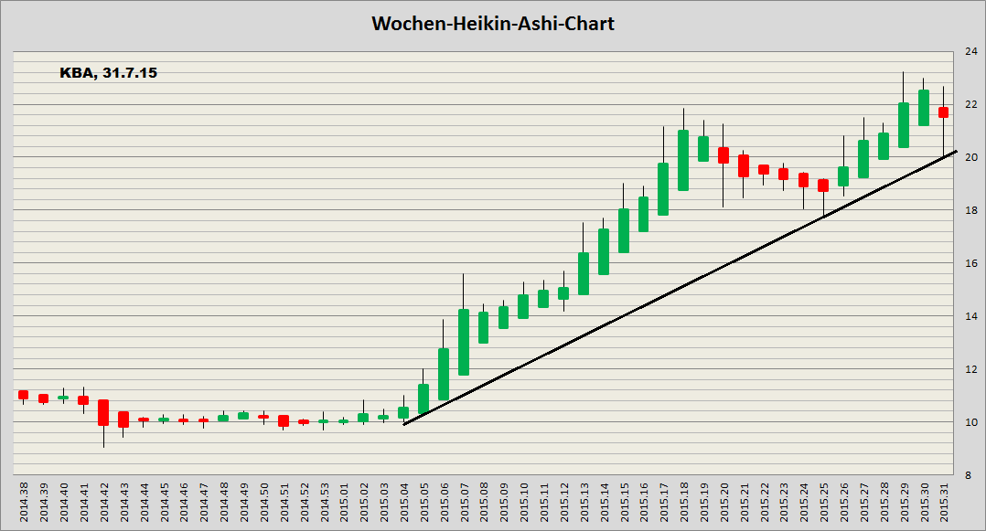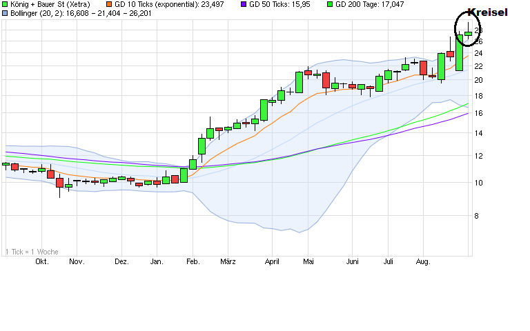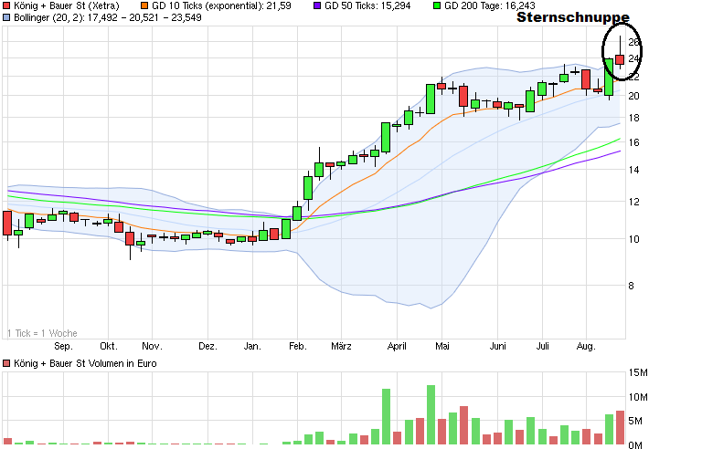 die KBA hält sich deutlich über dem Aufwärtrstrend, der zZt bei 20,72 läuft. Auch das Juli-Hoch wurde aus dem Markt genommen. Das langbeinige Spinning-Top im HA-Chart zeigt an, daß noch nicht alle Zweifel am Fortbestand des Trends beseitigt sind.