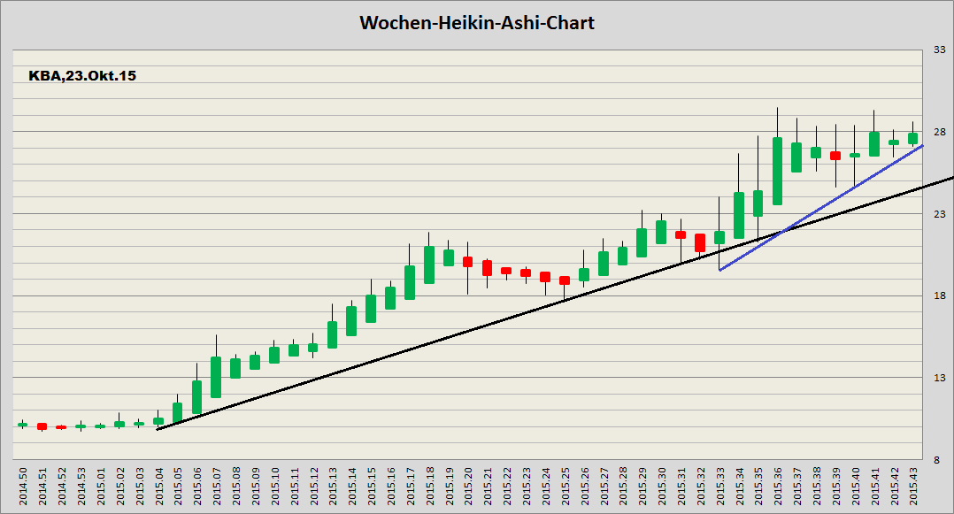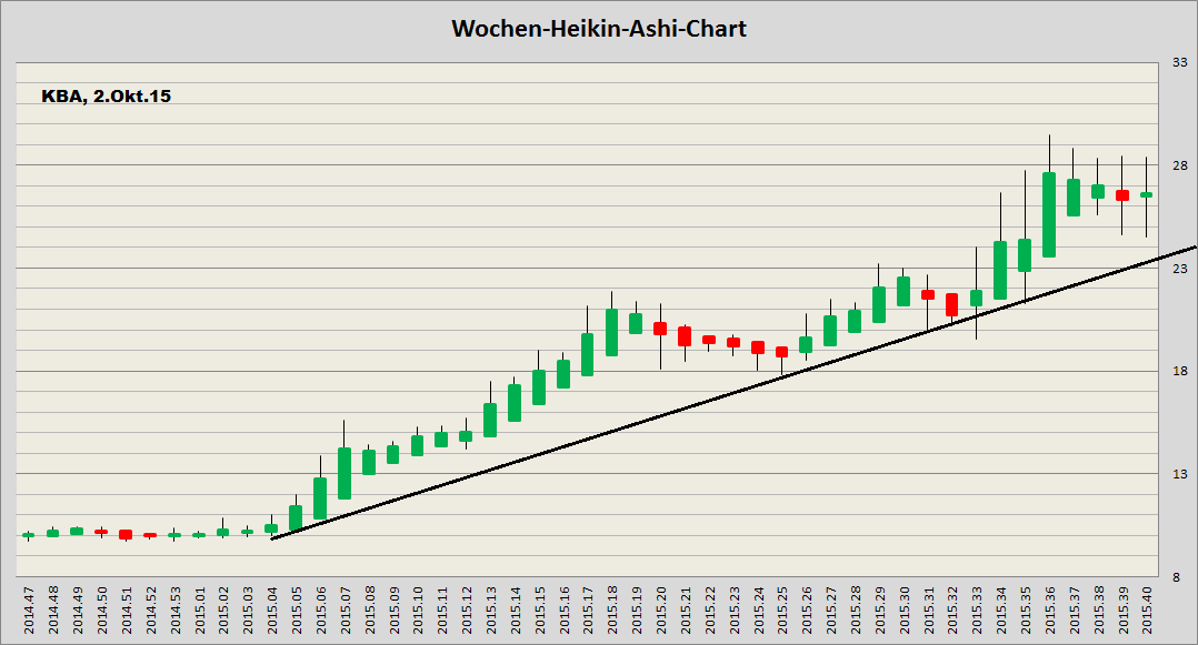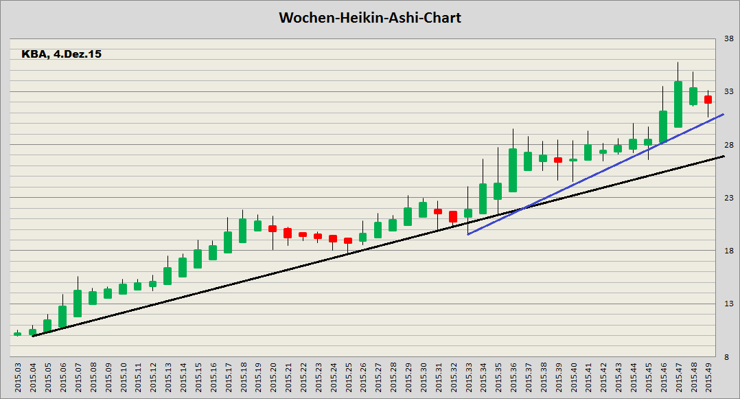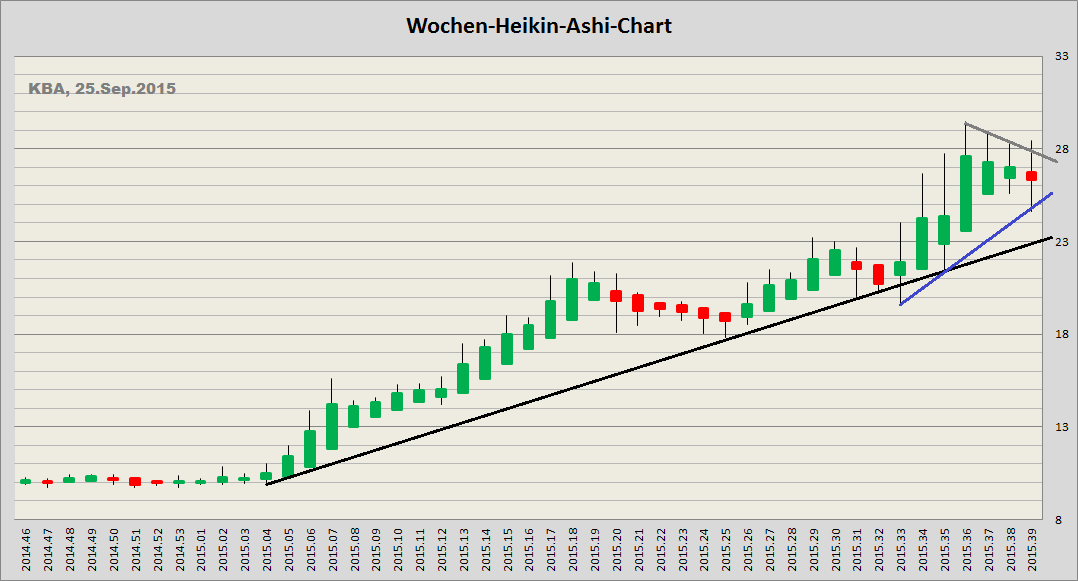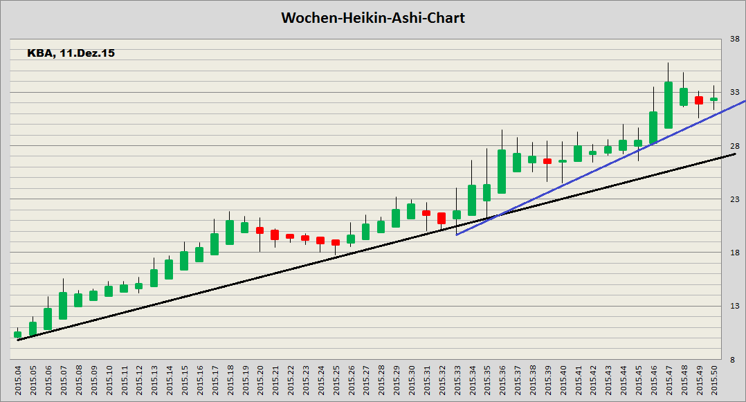 im Wochen-HA-Chart zeigt sich zwar eine rote Kerze, diese bewegt sich aber noch innerhalb einer Korrekturflagge. Im Wochenkerzenchart (nicht dargestellt) hat man einen Kreisel mit Möglichkeit auf eine neuerliche Aufwärtsbewegung. Trends sind weiterhin intakt.