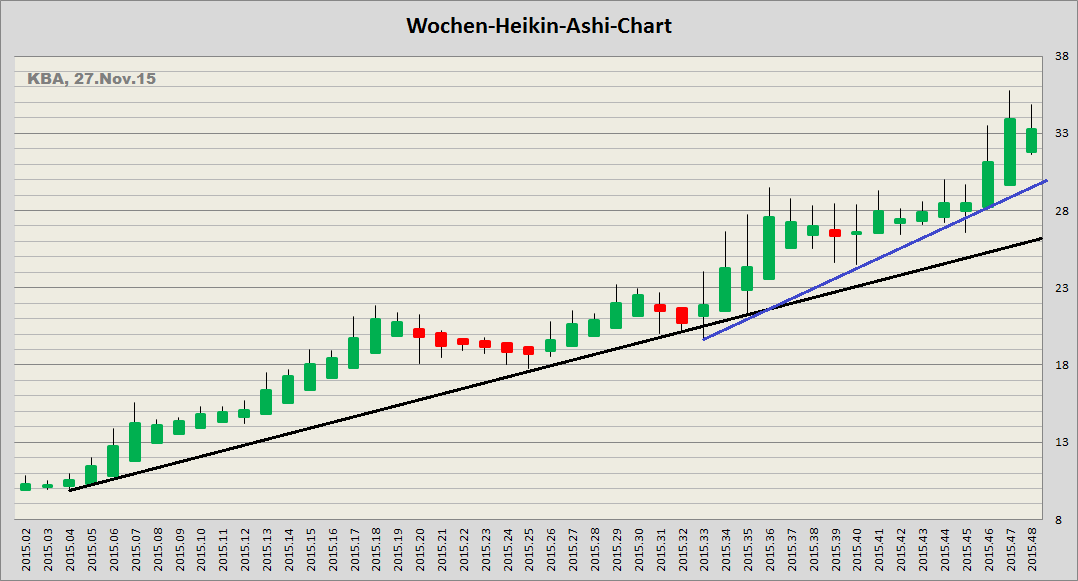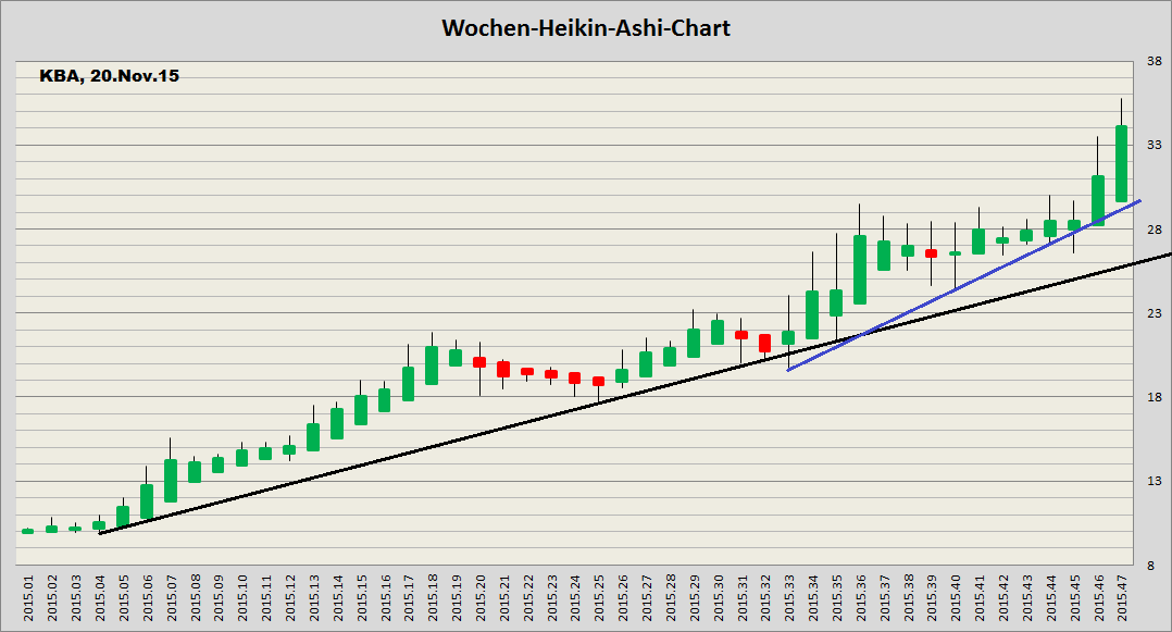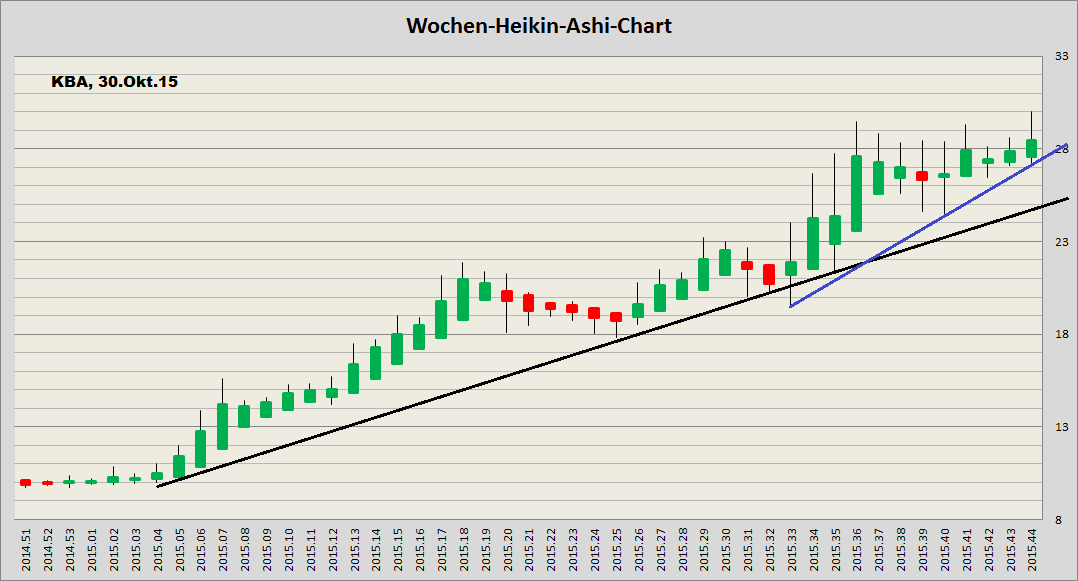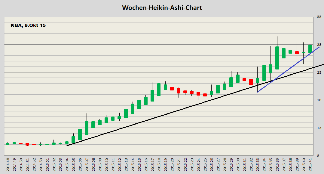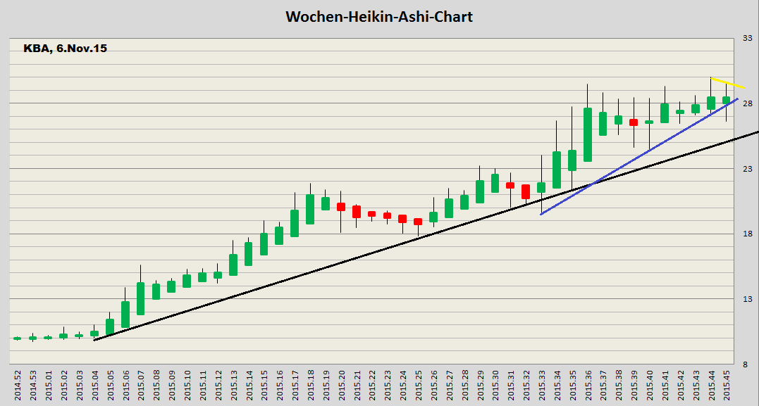 im Wochen-HA-Chart zeigt sich zwar eine rote Kerze, diese bewegt sich aber noch innerhalb einer Korrekturflagge. Im Wochenkerzenchart (nicht dargestellt) hat man einen Kreisel mit Möglichkeit auf eine neuerliche Aufwärtsbewegung. Trends sind weiterhin intakt.