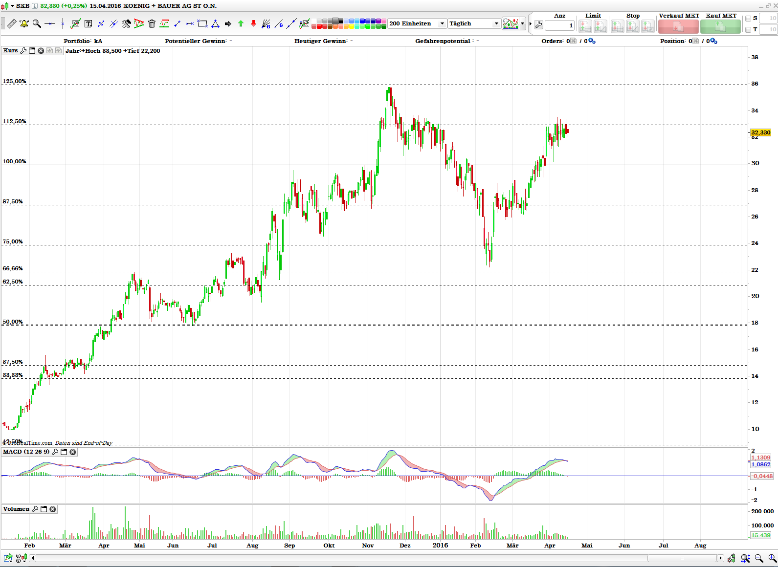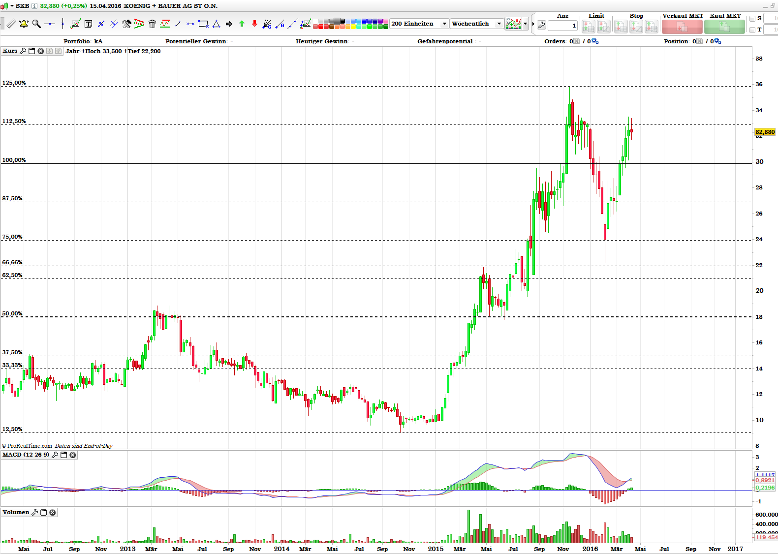 Hab nun alles über könig und bauer gelesen, was es gibt. Top bilanzen und wirklich JEDER analyst stuft die auf buy ein. Das schöne ist, dass der derzeitige Kurs noch günstig bewertet ist. Es wurde noch nichtmal mehr das das letzte hoch von 35€ erreicht. Nach den top! zahlen letzte Woche wären hier 45-50€ der richtige kurs! Die 10% sind erst der Anfang!30% innerhalb der nächsten 2-3 Monate sind möglich! Top buy!