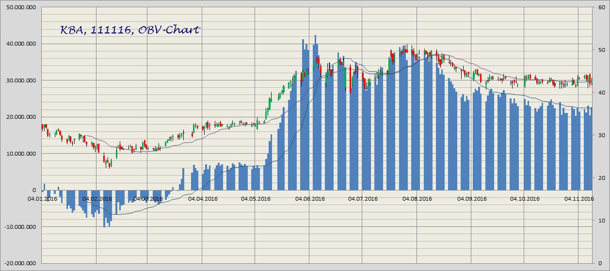wenns dir nur ums Lernen geht: Eine Divergenz zw einem Volumenindikator und dem Preis wird als negativ angesehen. Genaueres zum OBV findest du hier