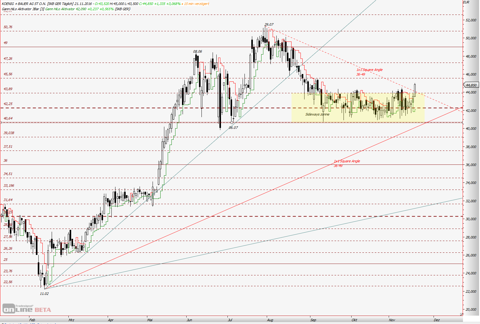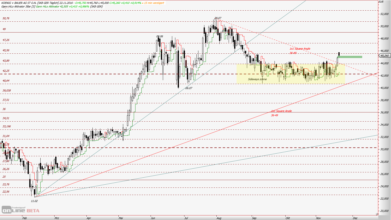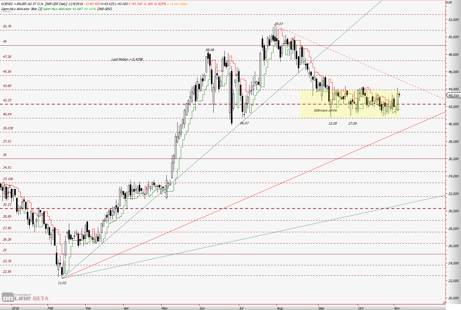 1. Im Fall, dass der Trade gegen mich läuft und Kurs wieder nachgibt - beim Bruch (mit Schlusskurs) der Oberkante (also ca. 44€) sofort raus.
