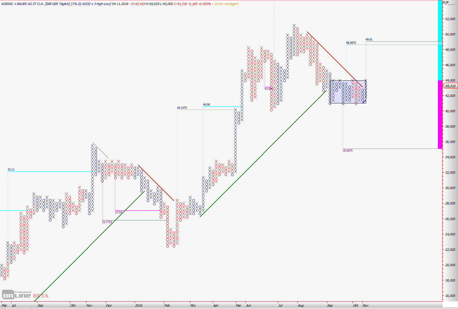 Würde z.B. Kurs in der nächsten Woche ausbrechen, dann hätten wir nach P&F Kursziele nach unten ca. 26€ und nach oben 56€