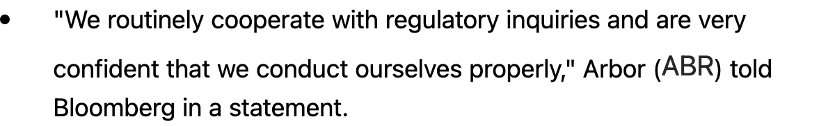 und was sagt arbor realty selber zu den vorwürfen? das sei eine reine routine untersuchung und man sei sehr zuversichtlich, dass man vorschriftsgemäss gearbeitet habe.