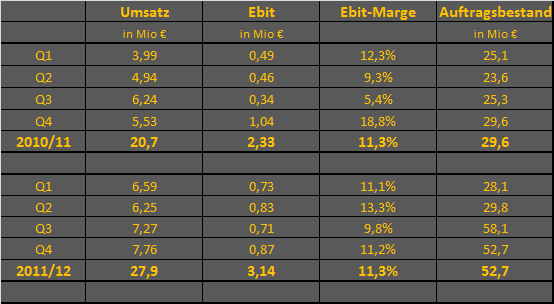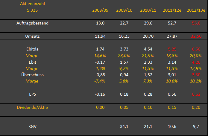 Im letzten Jahr hatte man also einen gesicherten Auftragsbestand, der in 2011/12 abgewickelt werden konnte, von 17,2 Mio €. Es wurden dann letztlich 27,9 Mio €. Ich will das jetzt nicht hochrechnen, aber ich glaube meine 32,5 Mio € sind konservativ. Selbst wenn ich nicht die prozentuale Steigerung sondern nur die absolute nehme, dann könnte man einen Umsatz von 35,5 Mio € als realistisch einschätzen.