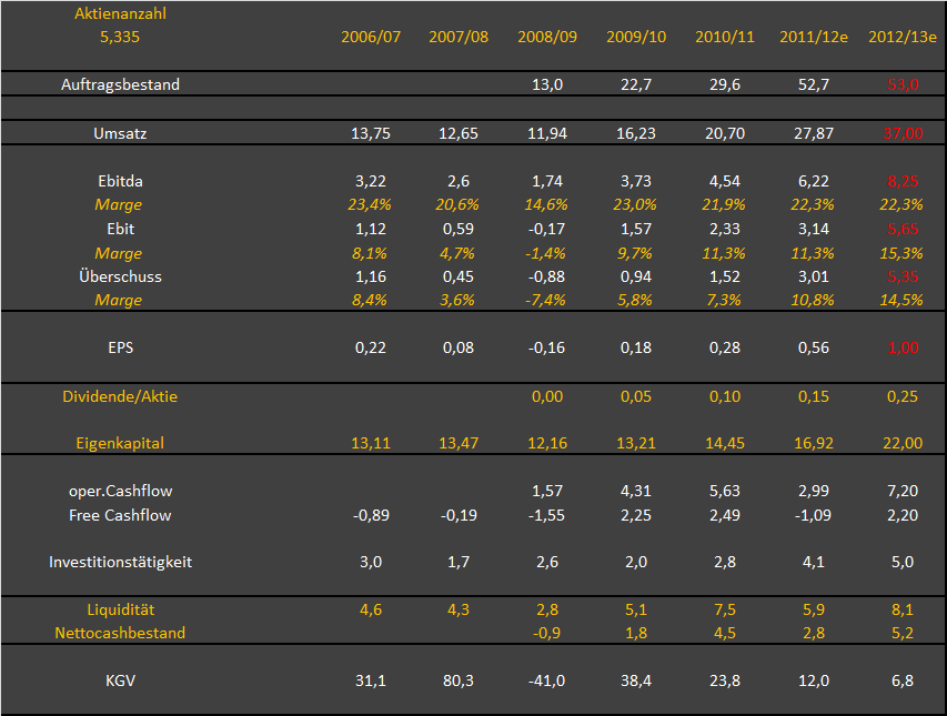 Yepp, kann man sich eigentlich leicht ausrechnen, auf was das (auch beim Ebit) hinausläuft. Vorletztes Jahr gabs noch 2,2 Mio Abschreibungen, letztes Jahr gabs 3,1 Mio Abschreibungen. Der Unterschied entspricht ja fast diesen 0,82 Mio €. Die Marge wird vermutlich nicht nur durch diese Ersparnis sondern auch durch andere Skaleneffekte deutlich steigen. Aber ich warte erstmal die Q2-Zahlen im Mai ab, um da eine genauere Analyse zu machen. Würde mich aber nicht wundern, wenn die Ebit-Marge von 11,3% in 2011/12 auf 14% in 2012/13 steigt. Ist vielleicht sogar zu konservativ, falls der Umsatz noch höher ausfällt als von mir bisher unterstellt. Man muss sich ja nur mal die Ebitda-Marge anschau. Wenn die trotz deutlichem Umsatzanstieg nur gleich bleibt, also keine Skaleneffekte auftreten, würde das Ebitda in diesem Geschäftsjahr schon bei 8,2-8,5 Mio € liegen. Rechnen wir mal mit 2,2-2,5 Mio € Abschreibungen, dann hätten wir ein Ebit von rund 6 Mio €, was einem Anstieg von 90% entspräche. Daran sieht man wie extrem hier die Effekte dieses Jahr auf das EPS wirken könnten. Nicht ganz ausgeschlossen, dass das EPS auf 1,0 € steigt. Ic glaub das hat bisher noch niemand auf der Rechnung. Der Konsens liegt vermutlich irgendwo bei 0,75 €.