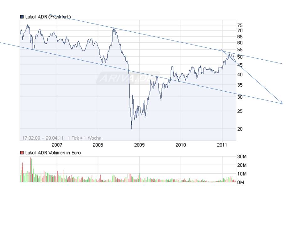 Bleiben wir bei den Fakten: seit Threadbeginn (siehe Chart) hat diese Aktie rund 30 % (in Euro) an nominalem Wert eingebüßt (rechnet man die Inflationsrate dazu, dann weit noch mehr an realem Verlust). Gleichzeitig stieg der Preis für den Rohstoff, den Lukoil produziert (Öl) von 53 auf 84 Euro - also ein Wertzuwachs um + 58 %.