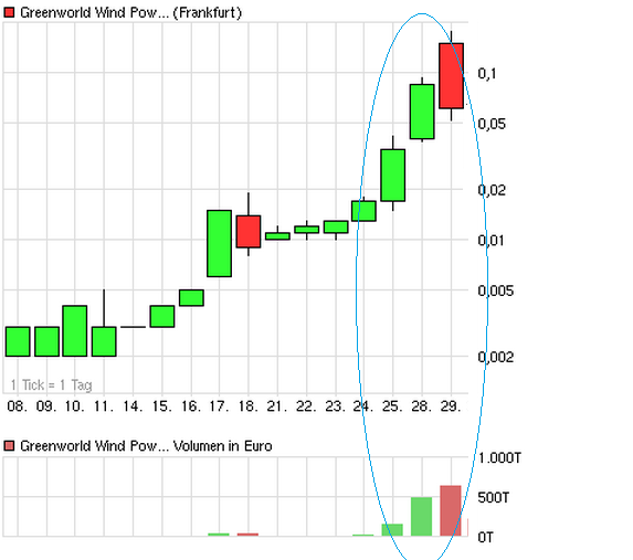 Siehe Chart von GREENWORLD WIND.Anstigeshoch waren 0,23 Euro in der Tagesspitze.