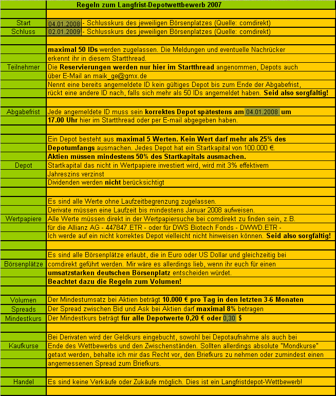 Die Regeln des Vergleichs­ bleiben die Gleichen wie 2007, und sie sind alle in der angehängten­ Graphik abgebildet­. Die IDs, die also an diesem Depotvergl­eich teilnehmen­ wollen, sollten sich diese Regeln genau durchlesen­! Unter Umständen kann ich darauf nicht frühzeit­ig genug noch einmal hinweisen,­ falls sich bei jemandem Fehler eingeschli­chen haben. Anmeldunge­n sind ausdrücklic­h nur hier im Thread möglich­!!!