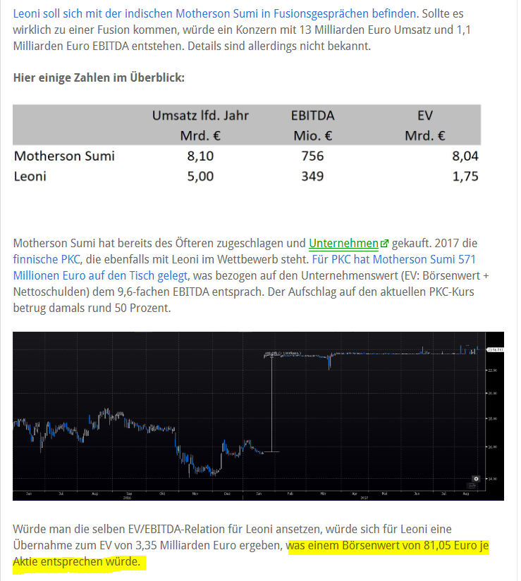 Aus einem Artikel des 'Aktionärs': Interessant sind in der Tat die Zahlen. Leoni hat aktuell ein EV/EBITDA, das halb so hoch liegt wie das von Motherson Sumi. Wenn die Inder übernehmen wollen, müssten sie sicherlich einen Preis in der Höhe des eigenen EV/EBITDA akzeptieren. Und dann kommt man auf die 81 Eur. Dann könnte der Deal laufen. Ich wäre dann sicherlich dabei, da mein Kursziel ja schon immer diese ominösen 80 Eur waren. Zu schön, um wahr zu sein.....
