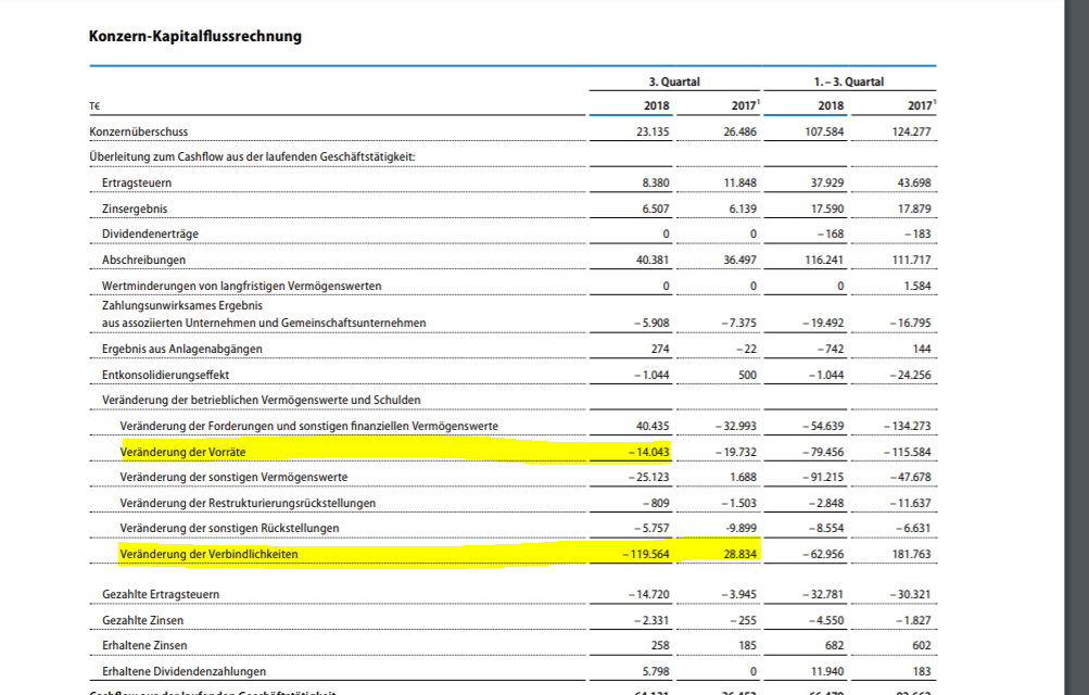 nicht wegen Anstieg und Vorräten/Forderungen so schlecht, jedenfalls nicht ungewöhnlich. Das war die letzten Jahre genauso und hat sich dann in Q4 wieder relativiert, weil man die Vorräte dann wieder reduziert hat.