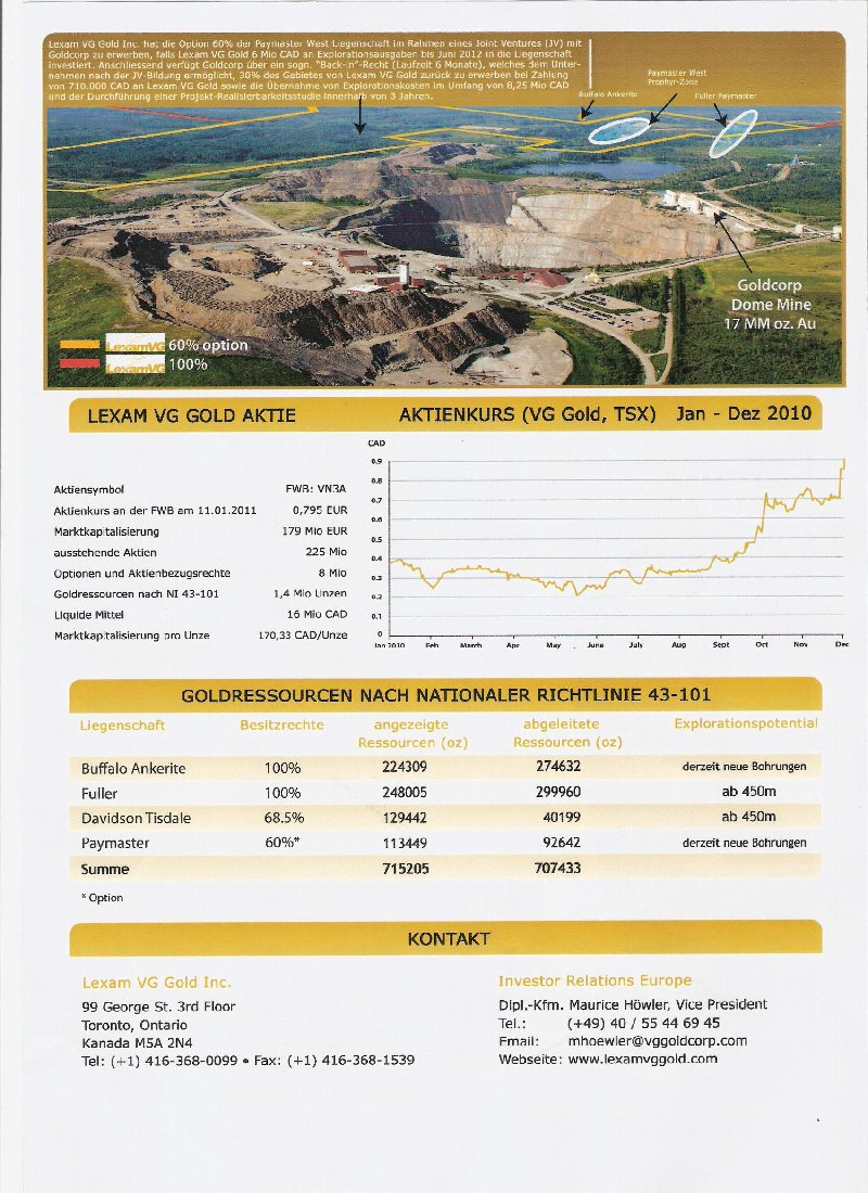 Was mich wundert ist dass Tom im München-Interwiev CAD 5,00 als Ziel Sharepreis für die nächsten 5 Jahre angibt bei sich weiter gut entwickelndem Goldpreis. Irgendwie gibt das mir zu denken, da er solche Äußerungen öffentlich noch nie getätigt hat. Muss nichts bedeuten aber wir kennen ihn eher zugeknöpft was Zukunftsprognosen Sharepreis angeht. Ich weiss nur das er in Frankfurt 2007 von augenblicklichem 1 CAD Wert/Share gesprochen hat unter den damaligen Verhältnissen. Die 1 CAD haben wir ja erreicht als Startposition mit LEXVG - jedenfalls die wissen viel mehr als wir.