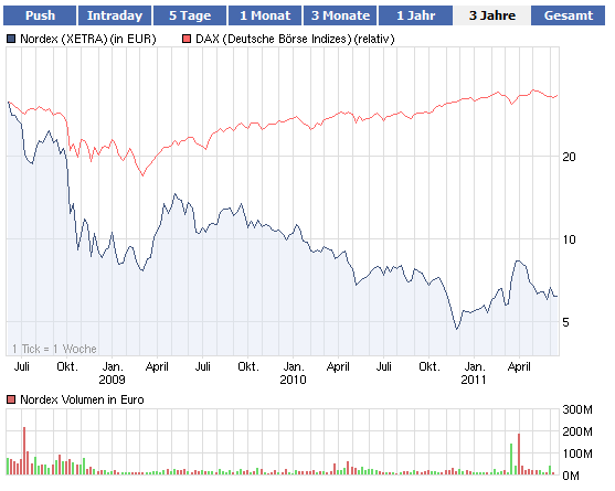 Für mich zählt dass ich hier um die 5 rein bin und dass ich hier nicht ohne Zweistelligkeit rauswill, ich hab mich sschon im Dezember, also vor Fukushima, ausgiebig mit nordex beschäftigt und hier zweistellige Kurse gesehen. Nach Fukushima wurden aber die Kursdrücker entlarvt, siehe Analysten und deren Miniorders auf Xetra plus die großen Pakete im Geldkurs, die immer schön bedient werden.