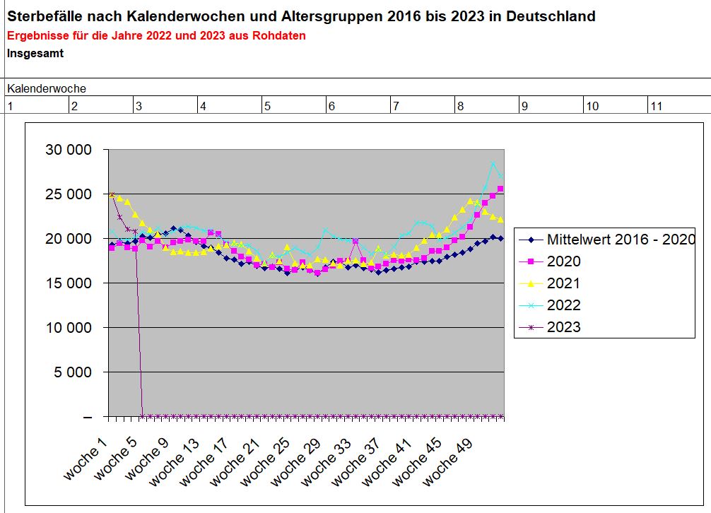 Dort kann man die Sonderauswertung herunterladen. Ich habe hier vom Reiter "D_2016_2023_KW_AG_Ins" die Sterblichkeit insgesamt nach Kalenderwochen ausgewertet: Durchschnittsbildung 2016 - 2020 und Vergleich mit den Folgejahren.
