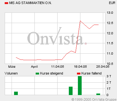 Darmstadt, 31. März 2004 - Vorstand und Aufsichtsrat der MIS AG (ISIN: DE0006612401) haben beschlossen, eine Barkapitalerhöhung gemäß Ziffer 3.5 der Satzung unter Ausschluss des Bezugsrechts um 340.000 Aktien zum Preis von 10,00 EUR je Aktie durchzuführen. Nach der Kapitalerhöhung wird das Grundkapital EUR 3.769.232 betragen.