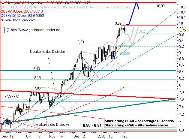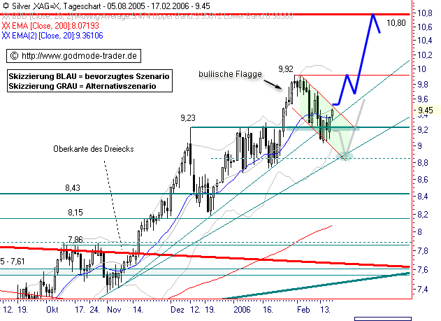 Kurz-Kommentierung: SILBER rutschte zu Beginn der Woche deutlich unter die 9,23 $ Marke und den steilen Aufwärtstrend, korrigierte aber nicht ganz bis in den Bereich der Kreuzunterstützung bei 8,80 $. Gestern gelang schließlich die dynamische Rückkehr über 9,23 $ welche dem Edelmetall heute Kraft für einen Folgeanstieg über die exp. GDL 50 (EMA50) bei 9,36 $ gibt. Damit sollte die Korrektur beendet und das kurzfristig bullische Szenario reaktiviert sein. Steigt SILBER jetzt auf Tagesschlussbasis über den kurzfristigen Abwärtstrend als Oberkante einer Bullenflagge bei 9,52 $ an, ist ein direkter Anstieg zum Jahreshoch bei 9,92 $ wahrscheinlich. Darüber sollte sich die Aufwärtsbewegung in Richtung mittelfristigem Kursziel bei 10,80 $ beschleunigen. Alternativ dehnt sich die Korrekturbewegung in der bullischen Flagge noch bis 8,85 $ aus, so bald SILBER wieder auf Tagesschlussbasis unter 9,23 $ zurückfällt.