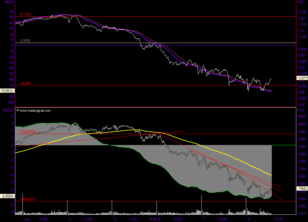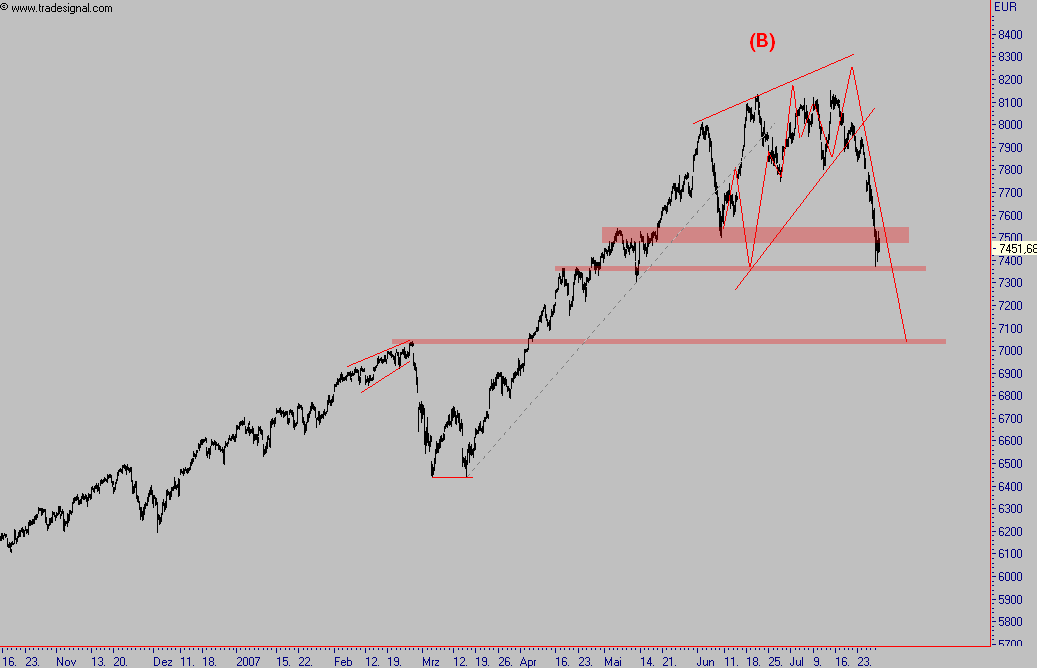 mögliche Variante ganz ohne Indikatoren von mir, Der Markt ist kurzfristig stark überverkauft, bis hin zum Stundenchart und die sehr schnellen Indikatoren im daily, nichts desto trotz muß bei antizyklischer Handlungsweise strikt abgesichert werden in diesem dynamischen Markt. Zwischen 7480 und 7550 befinden sich recht starkes Widerstandscluster, so besteht eine gute Chance auf eine deutliche Gegenbewegung. Einen möglichen Verlauf habe ich unten im Chart dargestellt