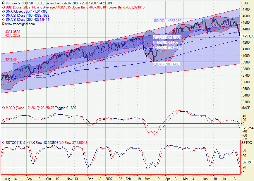 EuroStoxx liegt nun knapp unter MA 200 und Hoch von Feb 2007.
