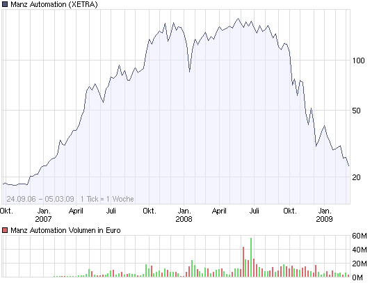 05.03.2009 - Wie erwartet hat es die Aktie von Manz Automation erwischt: Bei der üblichen Neuzusammensetzung der Indizes anhand aktueller Marktdaten muss Manz Automation den Platz im Technologieindex für DAX-Absteiger Infineon räumen.