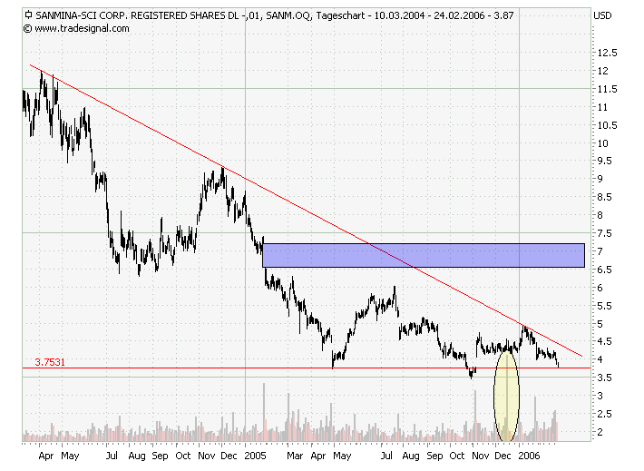 Sanmina SCI (WKN: 886288): Der kalifornische Auftragshersteller von Elektronik hat am Freitag ebenfalls einen Hammer ausgebildet, nachdem die starke Unterstützung bei 4 USD nicht gehalten hat. Mit dem Hammer wurde zugleich ein noch offenes Gap vom 4.11.2005 geschlossen. KUV liegt unter 0,2; KGV liegt bei 13.