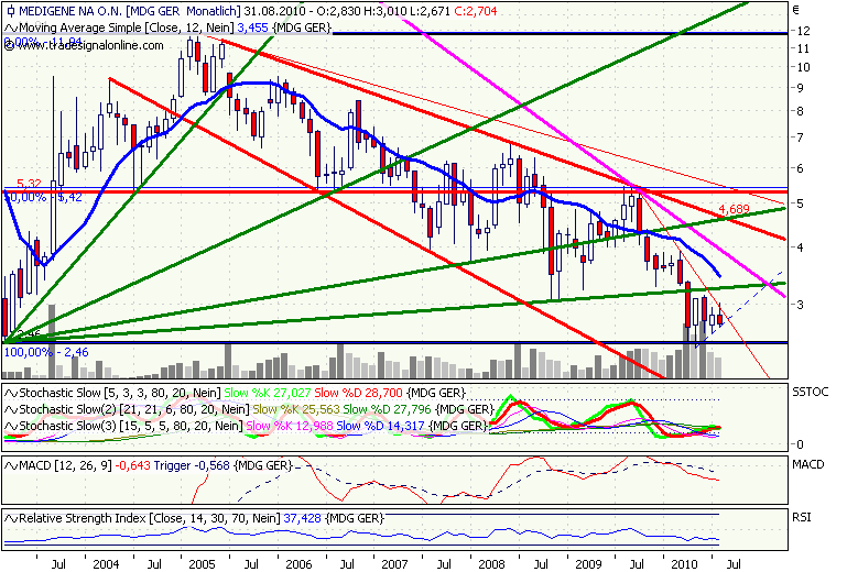 Sollte Medigene den Ausbruch aus Downtrend und steigendem Dreick schaffen, dann dürfte es bis ca. 3,75 gehen. Da waren die Hochs von Januar und März.