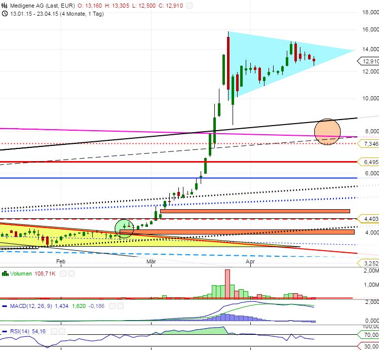 Dies spiegelte sich sehr deutlich im Verlauf des Kurses der Medigene in 2014, dessen detailierte Abschlusscharts von Richy finden sich hier .