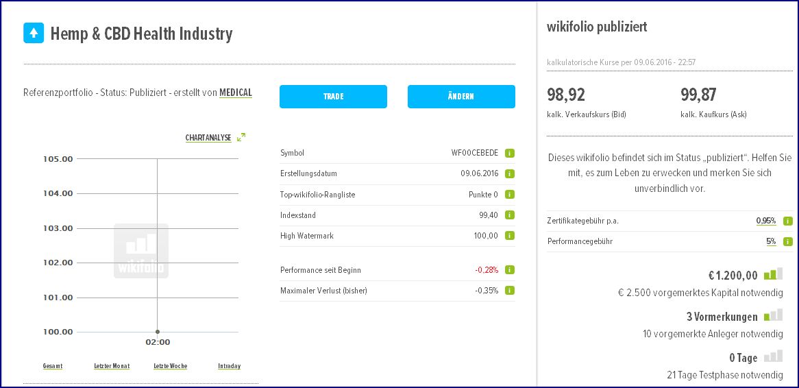 auch ich habe nun mein eigenes Wikifolio an den Start gebracht und mir fehlen nur noch ein paar wenige Vormerkugnen bis es investierbar gemacht werden kann.
