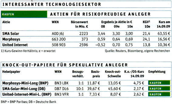 Eine höhere Notiz könnte sich in Zukunft auch bei Morphosys einstellen. Die Firma ist eine von ganz wenigen profitablen deutschen Biotechs. Der Spezialist für Antikörperforschung bei Krebserkrankungen ist vor allem als Dienstleister sehr gefragt. Im Auftrag großer Pharmafirmen wie Novartis oder Schering-Plough laufen zurzeit insgesamt mehr als 60 Antikörperprogramme. Erst zu Wochenbeginn brachte Morphosys eine Forschungskooperation mit der Schweizer Stiftung Find unter Dach und Fach. Das Management von Morphosys rechnet damit, dass es in den kommenden Jahren 19 Antikörperprogramme bis zur Marktreife schaffen könnten. BÖRSE ONLINE setzt konservativer an. Doch schaffen es nur zehn Prozent, wäre das Potenzial immer noch enorm. Da Antikörpermedikamente Milliardenumsätze erreichen können, bedeutet eine fünfprozentige Umsatzbeteiligung allein für einen Antikörper einen jährlichen Profit von 50 Millionen Dollar.