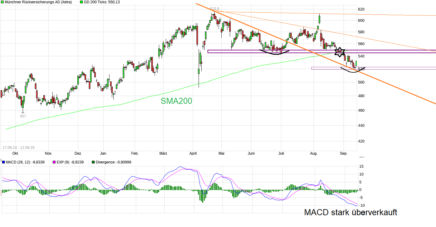 Tja, da hat es doch nicht so einfach im Bereich der SMA200 schon Halt gemacht. Ging jetzt runter bis ca. 520€. Inzwischen ist der MACD im Daily Chart so stark überverkauft wie schon lange nicht mehr. Von daher wäre hier auch mal wieder eine technische Gegenbewegung überfällig. Zumindest bis in den Bereich 545/550 oder zurück zur SMA200. Bin jetzt wieder mit einer kleinen gehebelten Position dabei. SL falls das jüngste Low nochmal unterboten würde. Was das 3. Quartal ja immer stark mitbestimmt, daß sind die Ausmaße der Hurrikan Saison. Und das ist eigentlich bislang weniger stark als in Vorjahren. Wobei nicht die Schäden relevant sind, sondern nur die versicherten Schäden. Schlagen die Stürme in ärmeren Regionen zu, dann ist die versicherte Quote der Schäden relativ gering. Vielleicht haben die Prognosen von einer starken Hurrikan Saison auch einige Investoren in den letzten beiden Monaten Gewinne mitnehmen lassen.