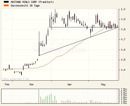.. Während es sehr gefährlich wärejetzt noch auf den bereits mit Volldampf fahrenden Zug bei LionOre aufzuspringen, bestechen unsere hochexplosiven Topfavoriten im Nickelsektor, MUSTANG MINERALS und Crowflight Minerals weiterhin durch ein geradezu sensationelles Chance-Risiko-Verhältnis! Aus dem Chart können wir ersehen, dass Mustang Minerals (aktuell 0,81) nur ganz kurz davor steht nach oben durchzustarten. Unser Rat: Jetzt Nachkaufen!