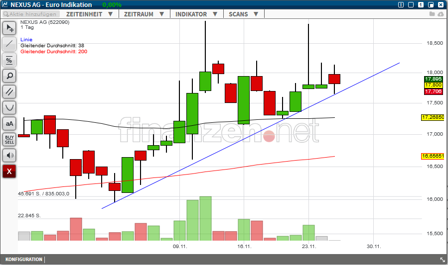 Entweder nehmen wir die 200 Tagelinie nach unten mit, oder wir können nach oben wieder über die 100D (17,14?) und 38D (17,17?) gehen.