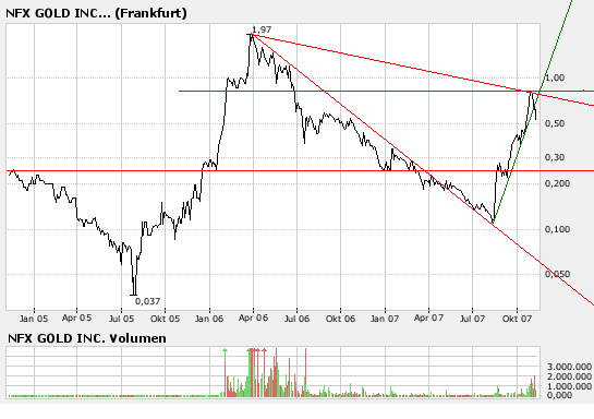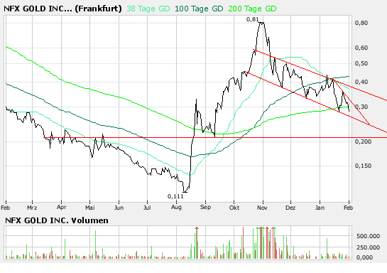 Ich mahne bei NFX Gold zur Vorsicht und lege euch den Verkauf zu 0,50 Eur nahe, denn der Chart ist eindeutig bei dem Wert nach unten durchbrochen worden und damit nimmt die Abwärtsdynamik - trotz - der heutigen Intradayerholung zu!
