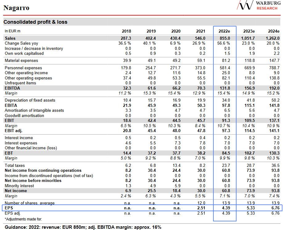 Versteh ich nich... Nagarro erhöht erneut Umsatzziel­ für 2022 auf 850 Mio. EUR. Nagarro erreicht im 3.Quartal ein EPS von 4,50 EUR (siehe Seite 17 im Q3-Bericht­). Warburg (Kursziel bei 220 EUR) errechnet in der aktualisie­rten Analyse ein EPS für das GJ 2022 von lediglich 4,39 EUR (siehe Anhang; die Analyse ist auf den Nagarro-IR­-Seiten als PDF zu finden). Im Q4 wird also der Umsatz weiter steil auf 850 Mio steigen, aber das Ergebnis soll dann ggü. den Vor-Quarta­len sinken?