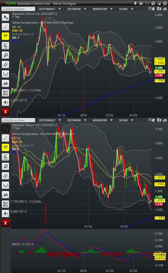 Standard Lithium macht aktuell keine Freude. Ob die Gerüchte nun zutreffen oder nicht, ob es Verhandlungen gibt oder nicht (s.o.). Der Kurs geht abwärts. Keine schöne Sache das ... Kurs aktuell im unteren Bereich des BollingerBandes, springt davon leicht ab und geht dann wieder abwärts. Der Gleitende Durchschnitt hat sich auch umgekehrt. Optimale Anordnung wäre von oben nach unten GD10, GD20, GD50, GD100. Seit der ersten Märzwoche jedoch GD100, GD50, GD20, GD10. Zumindest die 200-Tage-Linie ist noch etwas entfernt. Es bräuchte mal eine positive Meldung, um den Kurs wieder etwas zu treiben. Millennial Lithiums Abrutsch wurde zumindest etwas durch die Ankündigung des Beginns der neuen Probebohrungen gebremst. So etwas bräuchte es bei Standard Lithium mal wieder.