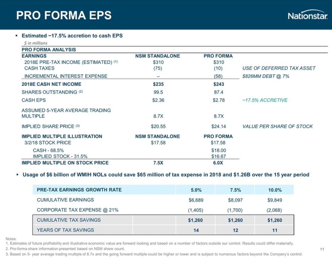 Nationstar zeigt hier auf Seite 11 https://www.sec.gov/Archives/edgar/data/1520566/.../d492124dex991.htm trotzdem auf, wie bei einer Pre Tax Earnings Growth Rate von 5% - 7,5% - 10% die NOLS in 11,12,14 Jahren aufgebraucht werden KÖNNTEN.