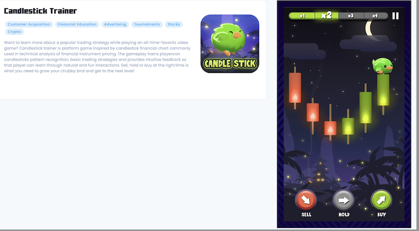 Möchten Sie mehr über eine beliebte Handelsstrategie erfahren, während Sie ein beliebtes Videospiel spielen? Candlestick-Trainer ist ein Plattformspiel, das vom Candlestick-Finanzdiagramm inspiriert ist, das üblicherweise in der technischen Analyse der Preisbildung von Finanzinstrumenten verwendet wird. Das Gameplay schult den Spieler in der Erkennung von Candlestick-Mustern und grundlegenden Handelsstrategien und bietet intuitives Feedback, so dass der Spieler durch natürliche und unterhaltsame Interaktionen lernen kann. Verkaufen, halten oder kaufen zum richtigen Zeitpunkt ist das, was Sie brauchen, um Ihren dicken Vogel wachsen zu lassen und die nächste Stufe zu erreichen!