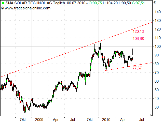 SMA Solar AG wird morgen durch die Decke schießen, falls die Duetsche Bank AG nicht dagegen aggiert, da sie ja noch ihre Zertifikate verkaufen will. Über 105 Euro und die Zertifikate können die sich in die Haare schmieren.